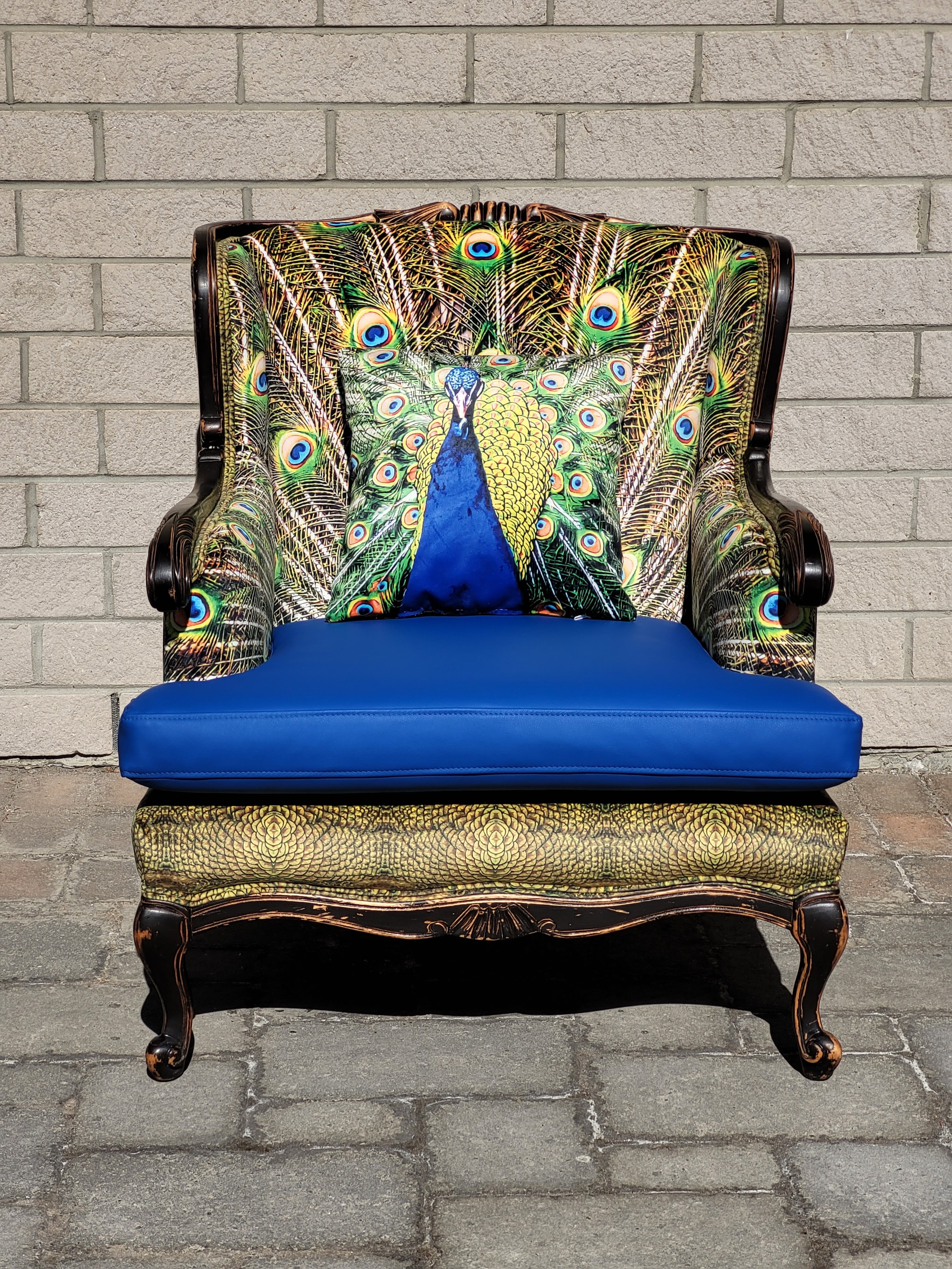 Printed on a Plush microfibre that gives you everything you need from an upholstery fabric, combined with an Gmelich German Top-Grain leather cushion and a pillow featuring the head, your Majestic Peacock awaits!